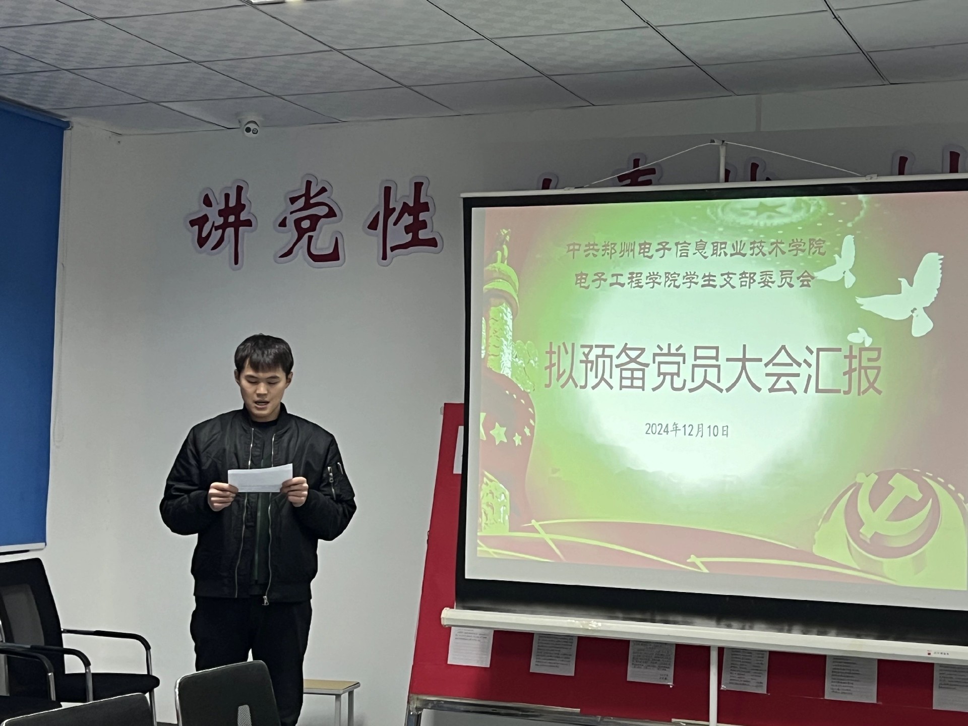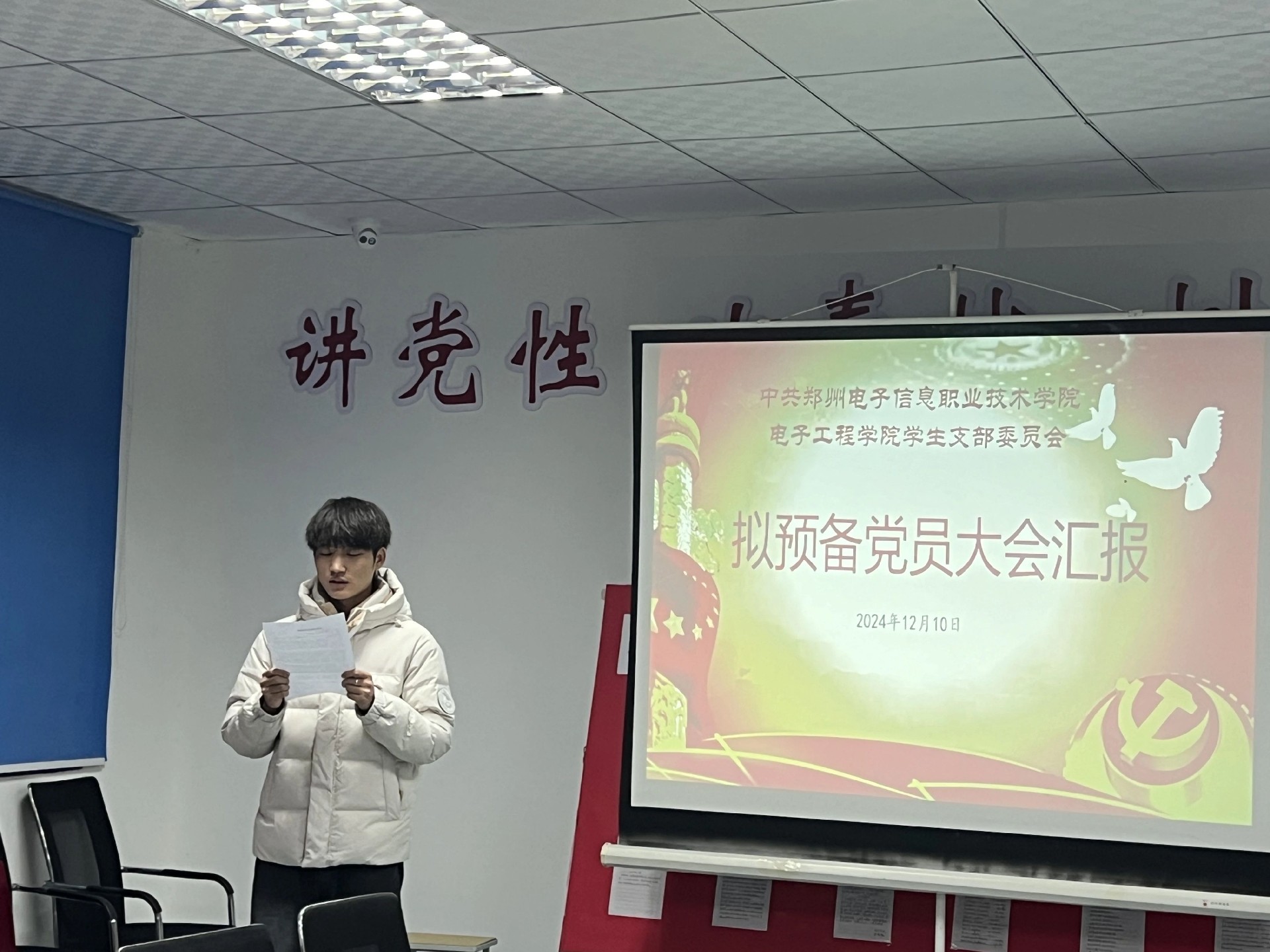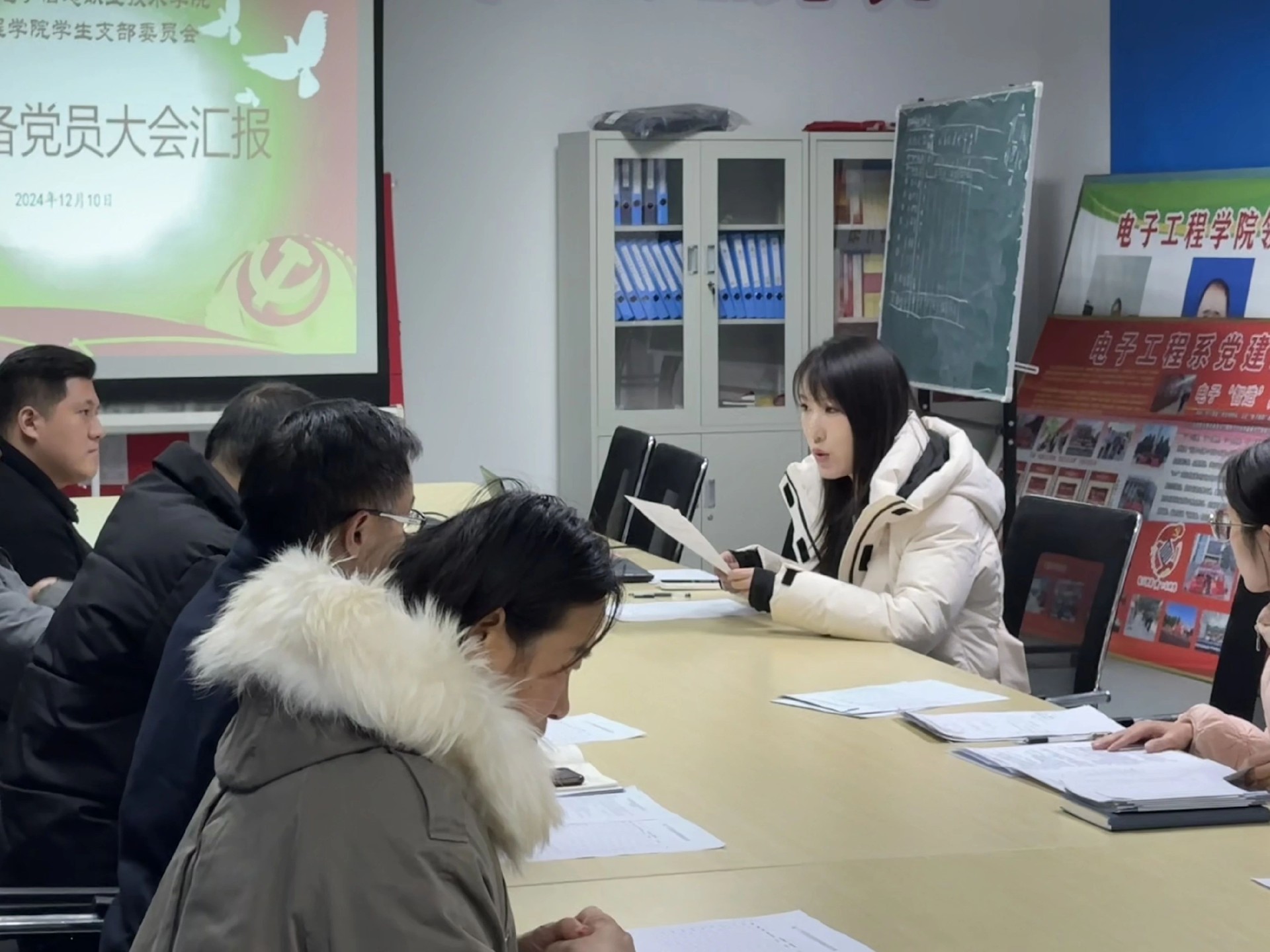 2024年12月10日電子工程學(xué)院在綜合辦公樓606會(huì)議室召開(kāi)學(xué)生黨支部接收預(yù)備黨員大會(huì)。會(huì)議由學(xué)生黨支部書(shū)記李玲玲主持,電子工程學(xué)院黨總支書(shū)記王正偉、學(xué)生支部書(shū)記李玲玲、教工支部書(shū)記李冰乳,學(xué)院教師黨員同志及8名擬預(yù)備黨員參會(huì)。