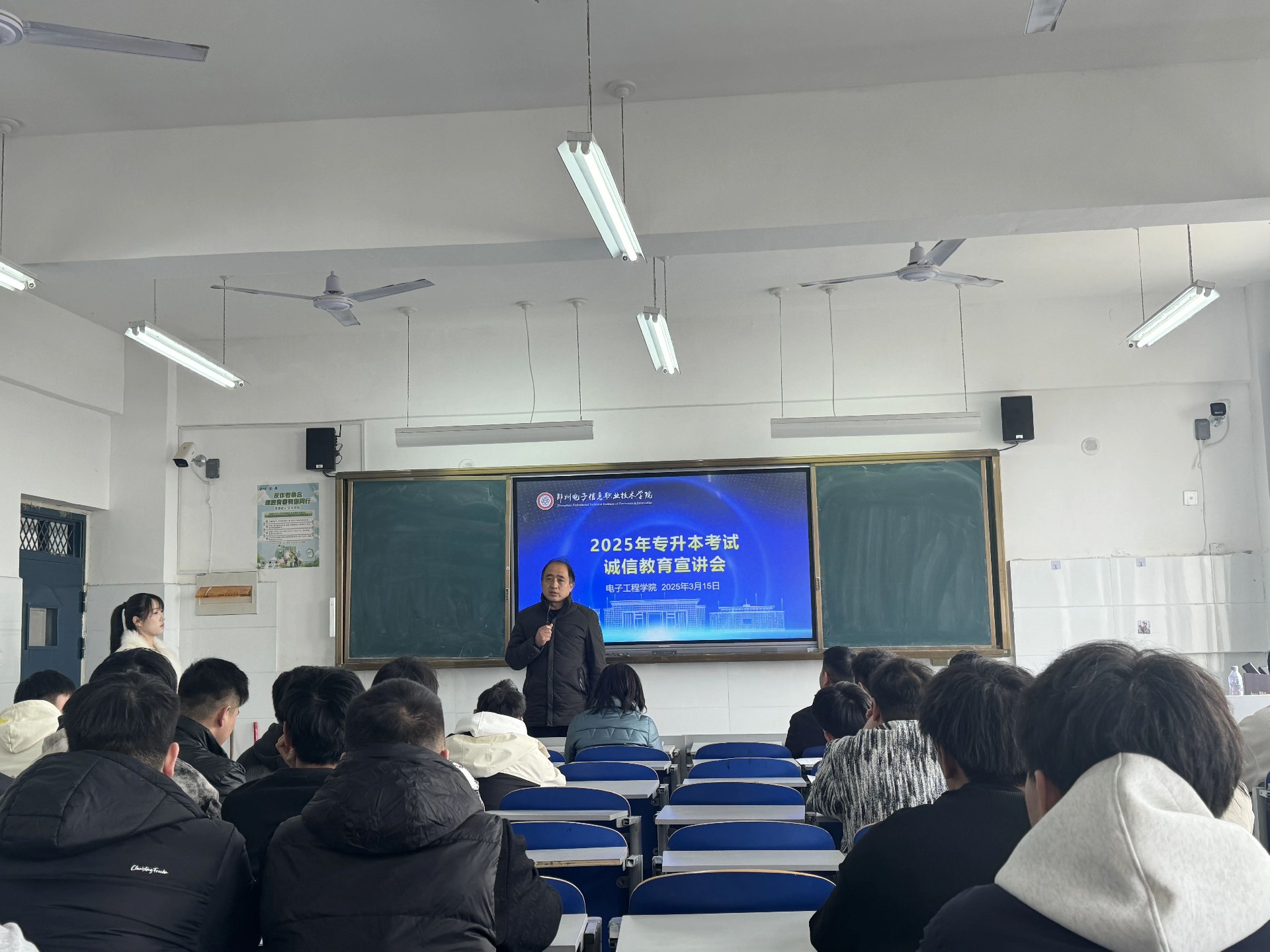 為進一步強化考風(fēng)考紀(jì)教育,培養(yǎng)誠信守紀(jì)意識,構(gòu)建良好的考試秩序,營造公平、公正的考試環(huán)境,電子工程學(xué)院于2025年3月15日在5號教學(xué)樓306開展2025年專升本學(xué)生誠信考試宣傳教育活動。