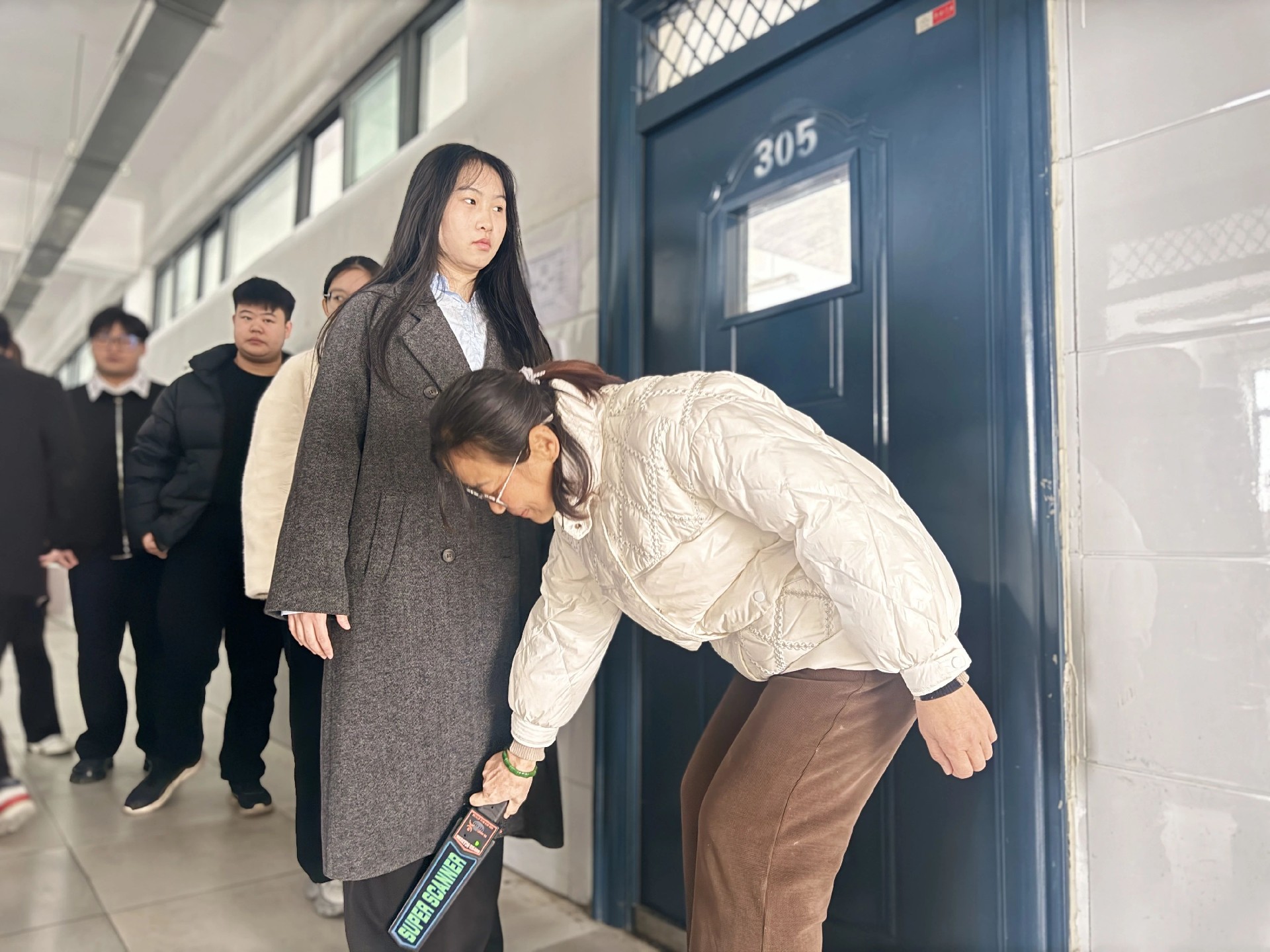考試前夕,組織開展模擬演練。在演練中,同學(xué)們積極配合,按照入場秩序,使用金屬探測儀按照從正面至背面、從上到下的順序進行詳細(xì)檢測,保證"人人過關(guān)",確保"無聲"通過。對于演練過程中發(fā)現(xiàn)的不合格現(xiàn)象,老師及時給予提醒糾正。