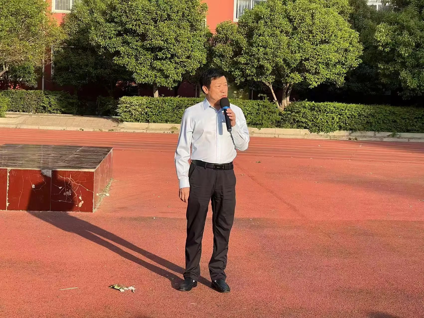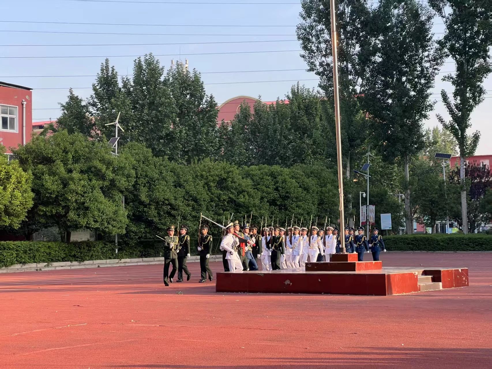儀式正式開始,國旗護衛(wèi)隊隊員身姿挺拔、精神抖擻,邁著整齊有力的步伐走向升旗臺。他們動作規(guī)范、步伐一致,展現(xiàn)出高度的紀律性和使命感。隨著激昂的國歌聲響起,五星紅旗在晨光中緩緩升起,迎風飄揚。全體師生神情肅穆,目光緊緊追隨著國旗,心中滿是對祖國的熱愛與崇敬。