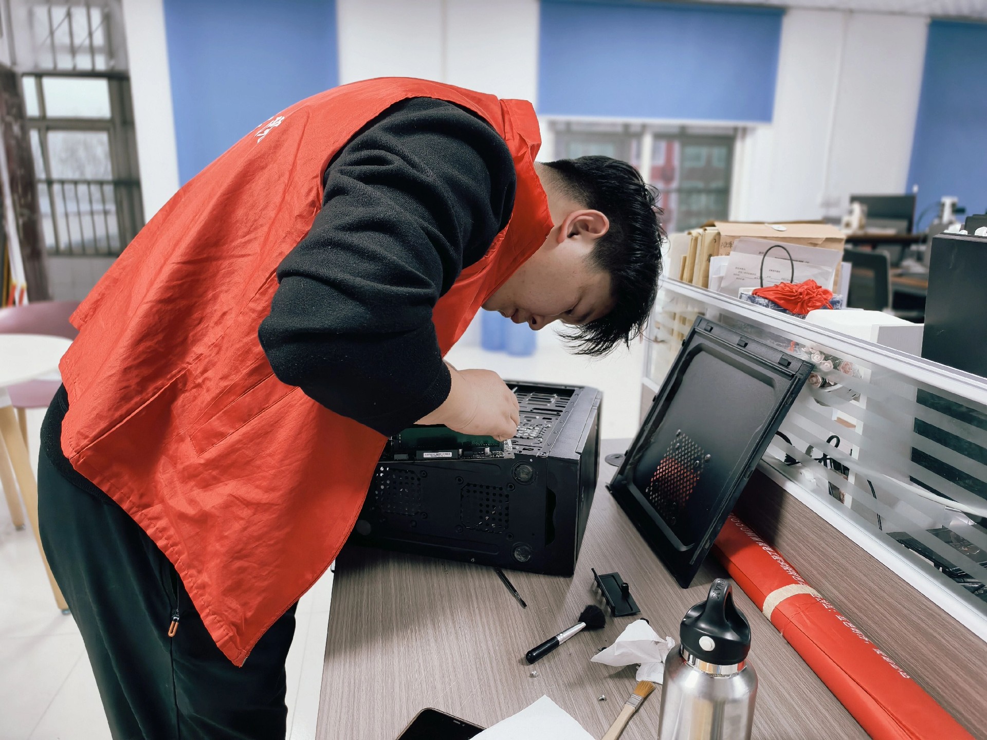為切實解決師生在教學(xué)、辦公及學(xué)習(xí)過程中遇到的電腦使用難題,保障教學(xué)辦公秩序順暢,電子工程學(xué)院學(xué)工部特組織開展電腦義修志愿服務(wù)活動,讓專業(yè)融入生活之中,讓知識技能真正”用得到、用得好”,讓專業(yè)真正成為服務(wù)生活的“硬支撐”。