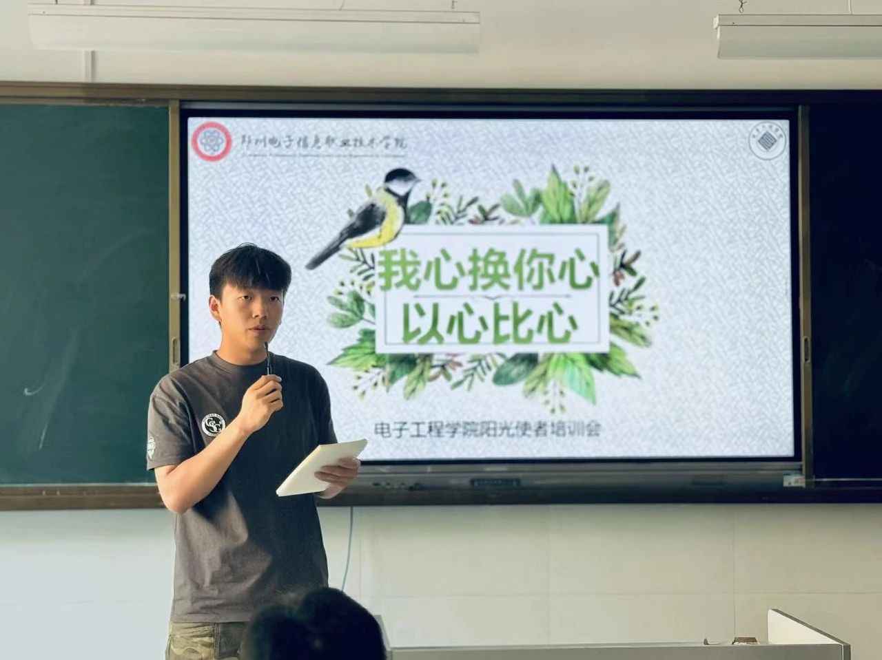 為了進一步完善電子工程學(xué)院大學(xué)生心理健康教育體系,提升學(xué)院學(xué)生整體心理素質(zhì)。5月14日下午13點,電子工程學(xué)院開展了“陽光使者”心理健康培訓(xùn)會,對學(xué)生進行了心理健康教育培訓(xùn),共有90余名電子工程學(xué)院宿舍心理信息員參與心理健康培訓(xùn)。本次活動主要是在讓同學(xué)們參加培訓(xùn)的過程中,正確的認識自己了解自己,關(guān)注自己的心理健康和心靈健康。