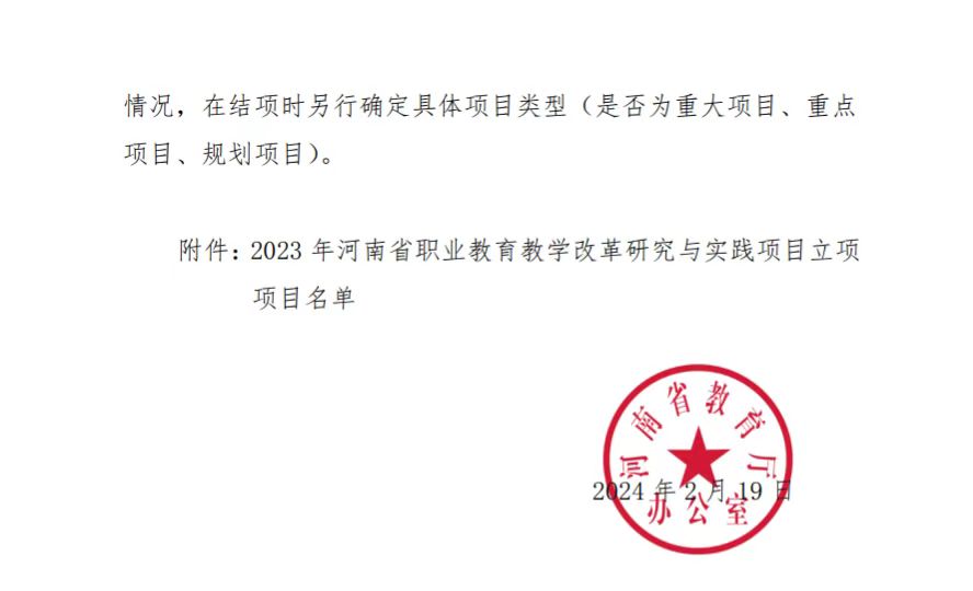 據(jù)《河南省教育廳辦公室關(guān)于開展 2023 年河南省職業(yè)教育教學(xué)改革研究與實(shí)踐項(xiàng)目立項(xiàng)工作的通知》(教辦職成〔2023〕472號):