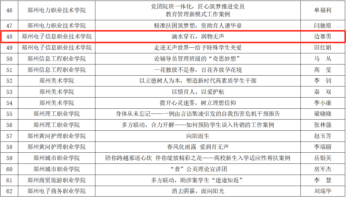 近日,鄭州市教育局辦公室發(fā)布《關(guān)于公布2023年鄭州地方高校輔導(dǎo)員工作優(yōu)秀案例評(píng)選結(jié)果的通知》(鄭教高函〔2024〕126號(hào))文件,我院輔導(dǎo)員邊賽男老師撰寫(xiě)的《滴水穿石,潤(rùn)物無(wú)聲》,榮獲2023年鄭州地方高校輔導(dǎo)員工作優(yōu)秀案例。