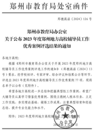 我院輔導(dǎo)員榮獲2023年鄭州地方高校輔導(dǎo)員工作優(yōu)秀案例